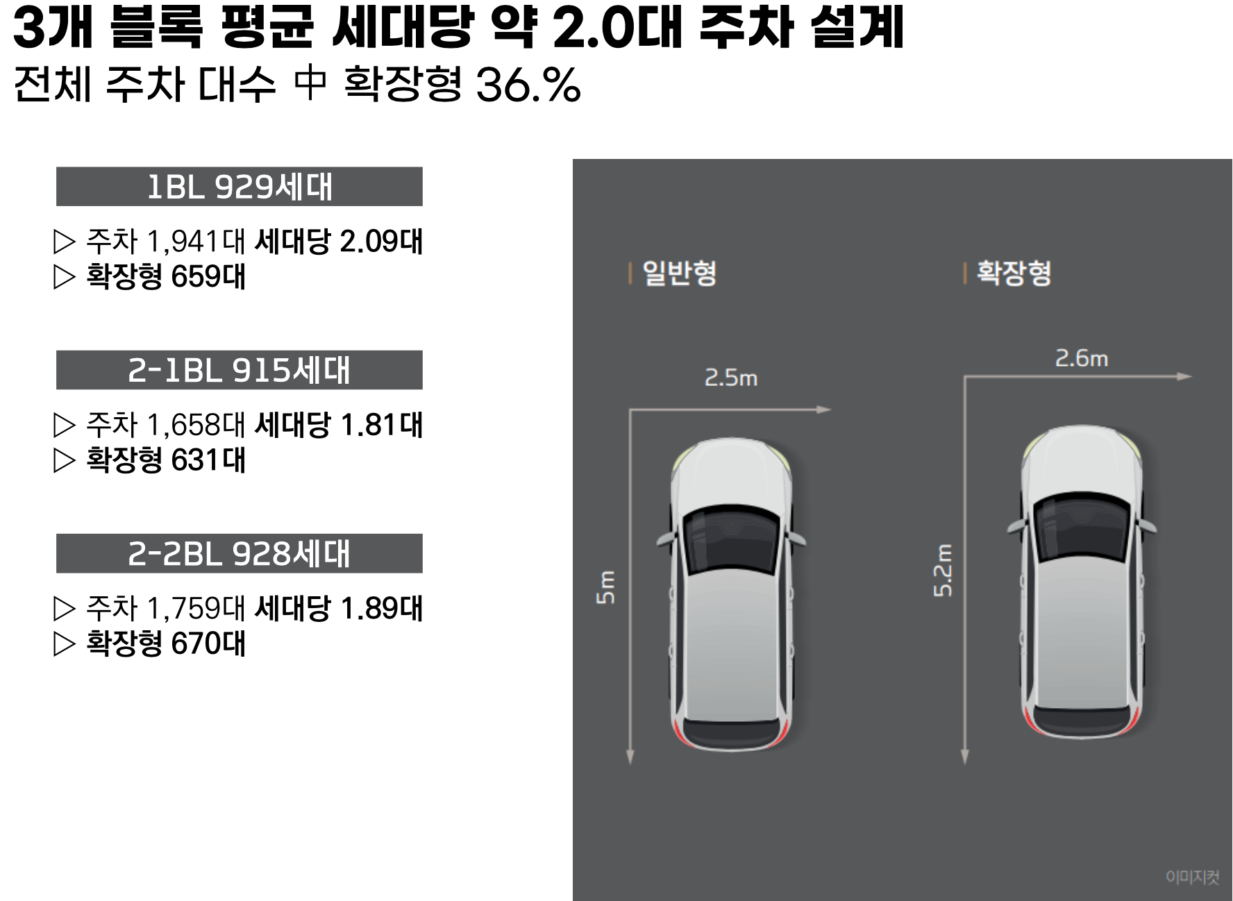 대규모 부지로 인해 2대 1 비율로 넉넉한 주차 공간을 확보하고 있으며 지하 3층에서 지하 1층까지 주차장이 구성되어 있으며 지상은 공원화되어 차가 다니지 않아 안전하게 자녀들이 놀 수 있는 환경이 조성되어 있습니다. 세대당 두 대의 주차 공간 확보는 큰 장점으로 이는 롯데캐슬의 네임밸류로 광주 최초인 것으로 추정됩니다.