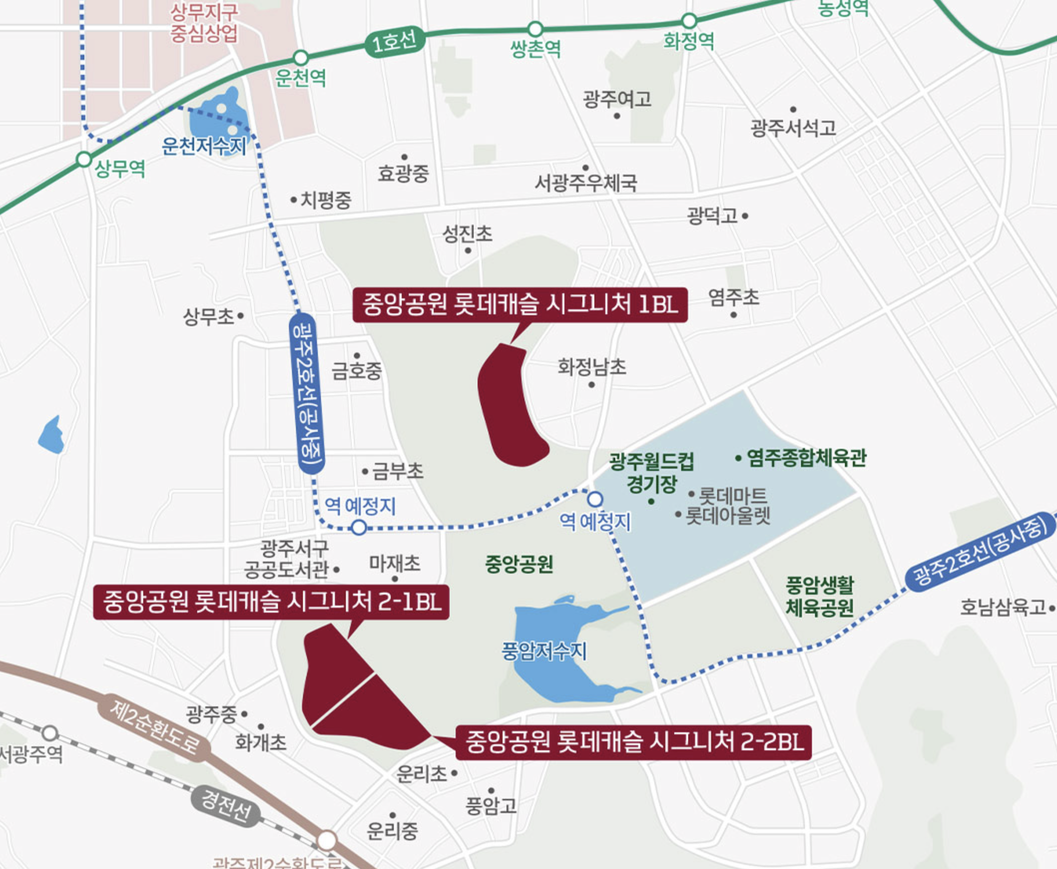 2. 민간공원 특례 사업 : 광주 중앙공원 롯데캐슬은 으로 조성된 가장 크고 넓은 공원 부지를 자랑하는 이 아파트는 염주체육관, 롯데마트, 금호지구, 풍암지구를 포함한 훌륭한 생활 인프라를 갖추고 있으며 1단지와 2단지로 나뉘어 총 2,772세대 규모로 광주 최대 규모로 광주아파트의 랜드마크 자리잡고 있습니다.
