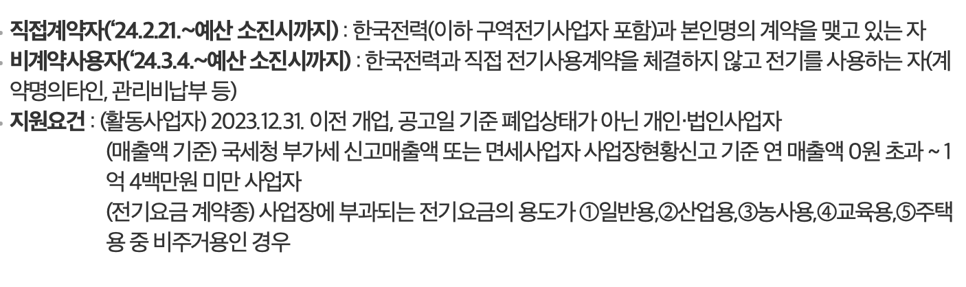 - 직접 계약자: 신청자 명의로 전기요금을 계약한 사업자는 별도의 서류 없이 신청 가능합니다.