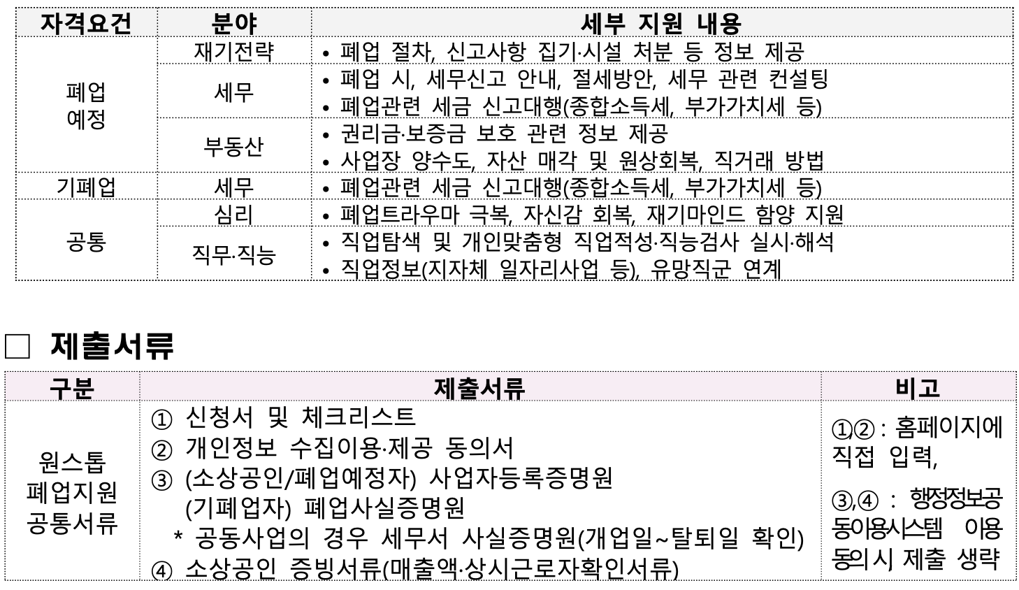 - 지원 대상 및 조건: 개인사업자 폐업지원금은 소상공인 폐업지원금과 유사하게 폐업했거나 폐업 예정인 개인사업자를 대상으로 하는데 임대차 계약서를 제출할 수 있어야 하고 반면 자가 건물인 경우는 제외됩니다. 폐업일이 2018년 1월 1일 이후여야 하며 사업장 이전이나 동일 장소 재창업은 지원에서 제외됩니다