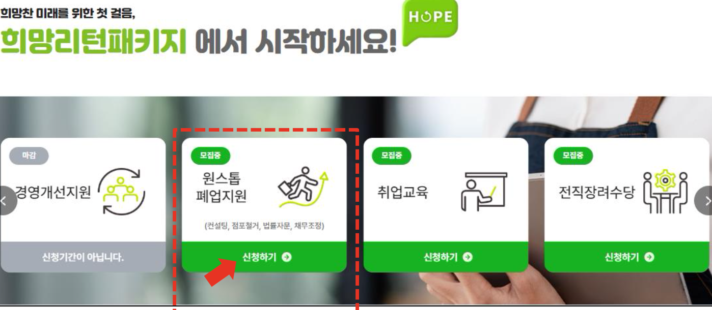 - 신청 방법 신청 절차: 폐업지원금은 온라인으로 희망리턴패키지 홈페이지에서 신청할 수 있는데 필요한 서류를 준비해서 제출하면 됩니다. 필요한 서류는 신청서, 사업자등록증명원, 임대차 계약서, 점포 건축물대장 등으로 신청은 순차적으로 이루어지며 개업일에 따라 신청 가능 시기가 다르므로 신청 전 확인하고 신청해야 합니다.