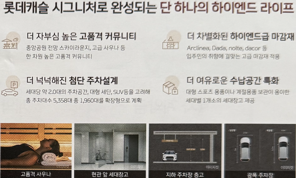 - 최적의 생활 인프라 근접 : 롯데캐슬 시그니처는 롯데마트와 롯데아울렛, 대형병원, 종합체육관(실내 스포츠 센터) 등이 가까워 일상생활에 필요한 모든 것을 쉽게 이용할 수 있습니다.
