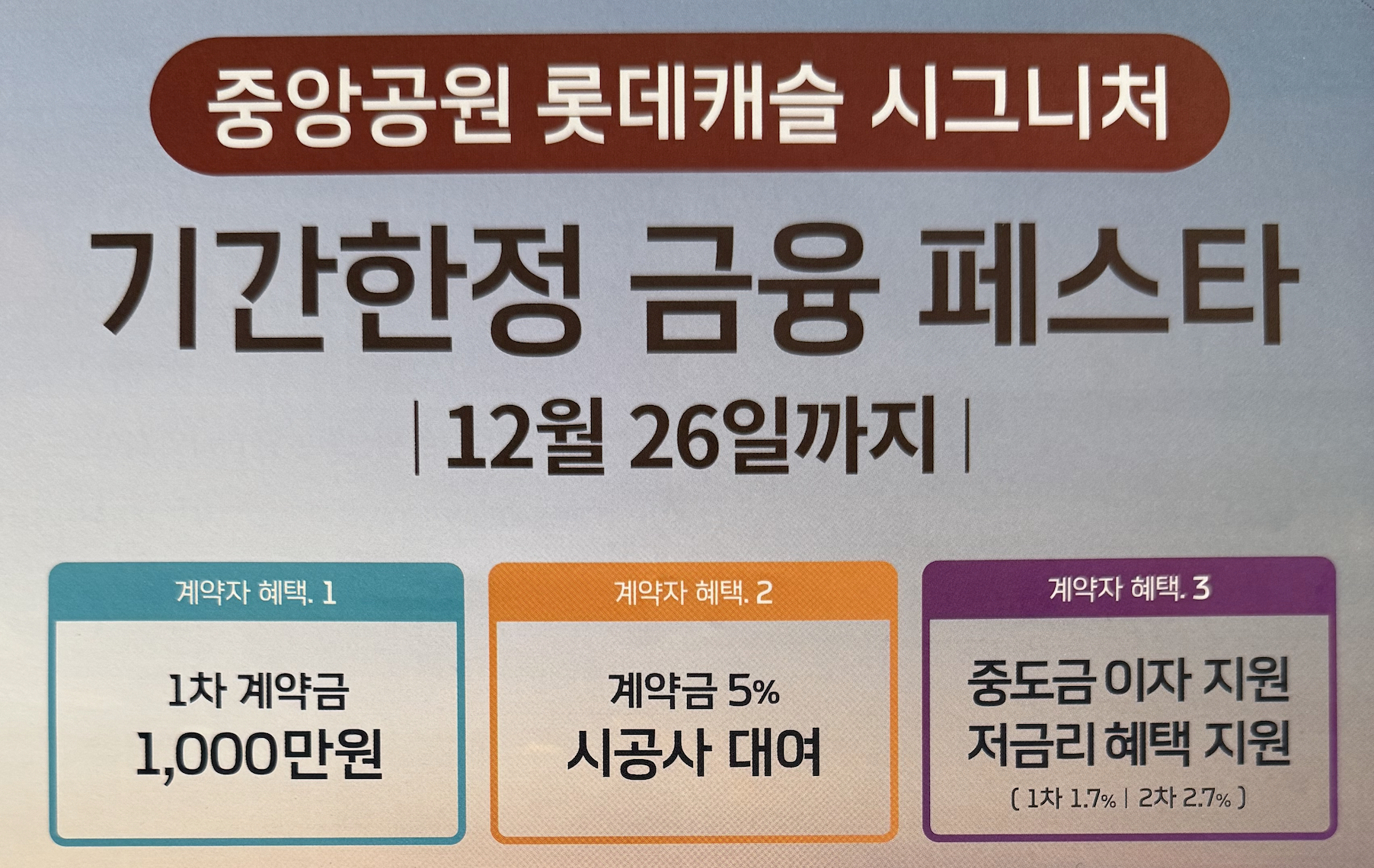 - 12월 26일까지 계약 완료 시 중도금 저금리 혜택 제공 : 12월 26일까지 계약을 완료한 세대는 중도금 1.7%의 저금리 혜택을 받을 수 있어 금융적인 부담을 줄일 수 있습니다.